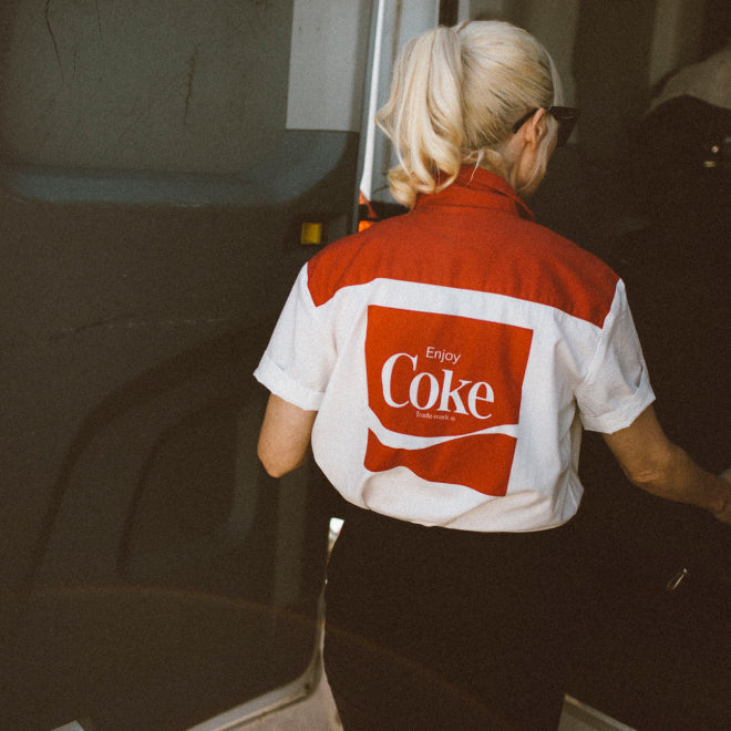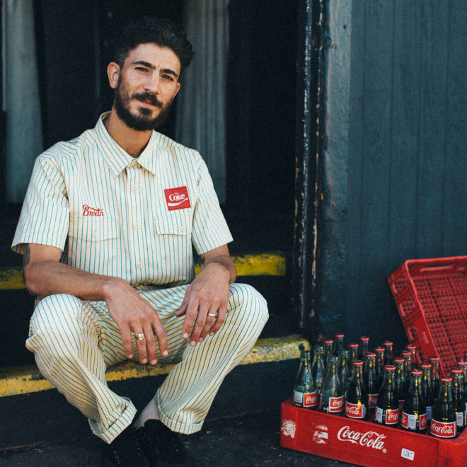 If you’ve been following our recent adventures, you’ll know that a big part of spring at Brixton is about layering floral prints and bold colors with surplus-inspired styles. We think pieces representing the energy of the ‘70s and Coca-Cola's uplifting spirit are perfect in the mix—like an ice-cold coke on a sunny day.