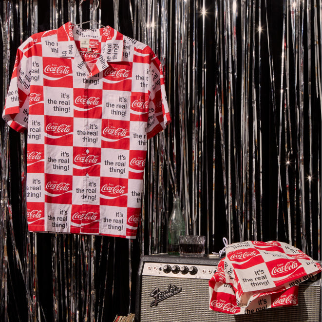 Another anchor piece is our Bunker Short-Sleeve Shirt featuring two eye-catching patterns. The first highlights the iconic green glass Coca-Cola bottle with a starburst print on a bold yellow background. Our red and white checkerboard is another key motif with It’s the Real Thing printed as a repeating graphic. Both of these options are also available with matching Voyage Shorts. These styles look great worn together or paired separately with other staples.