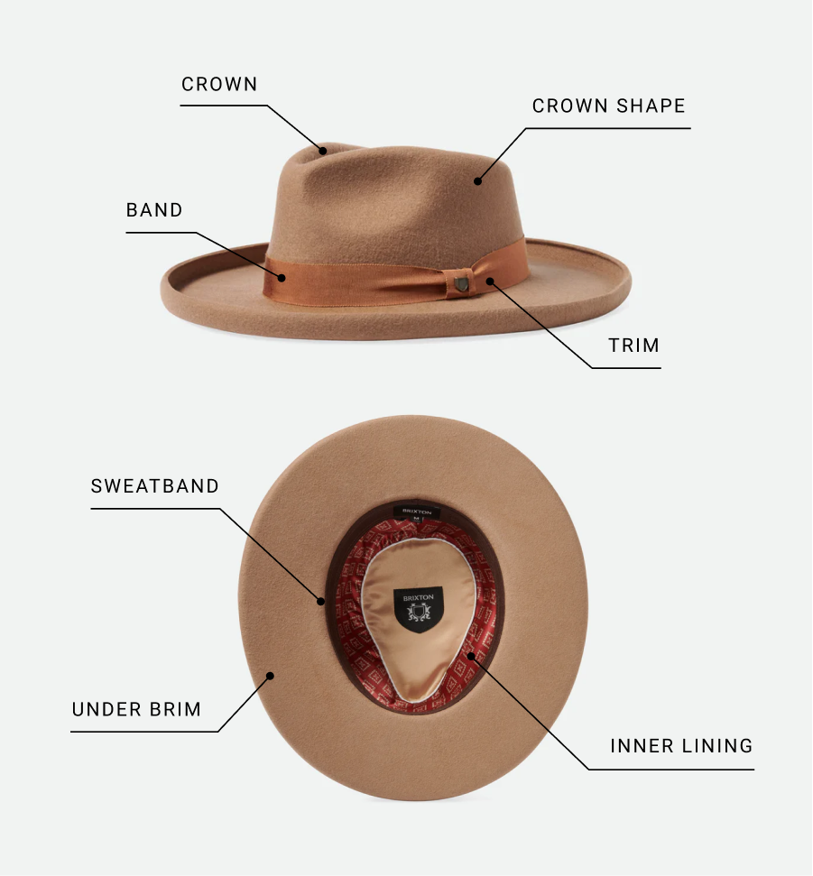 Sweatband: Also called the inner band, this is the hat’s interior band that helps ensure a good fit and keeps the hat shape intact; always located just above the hat’s underbrim; often made of leather or synthetic leather-like material.