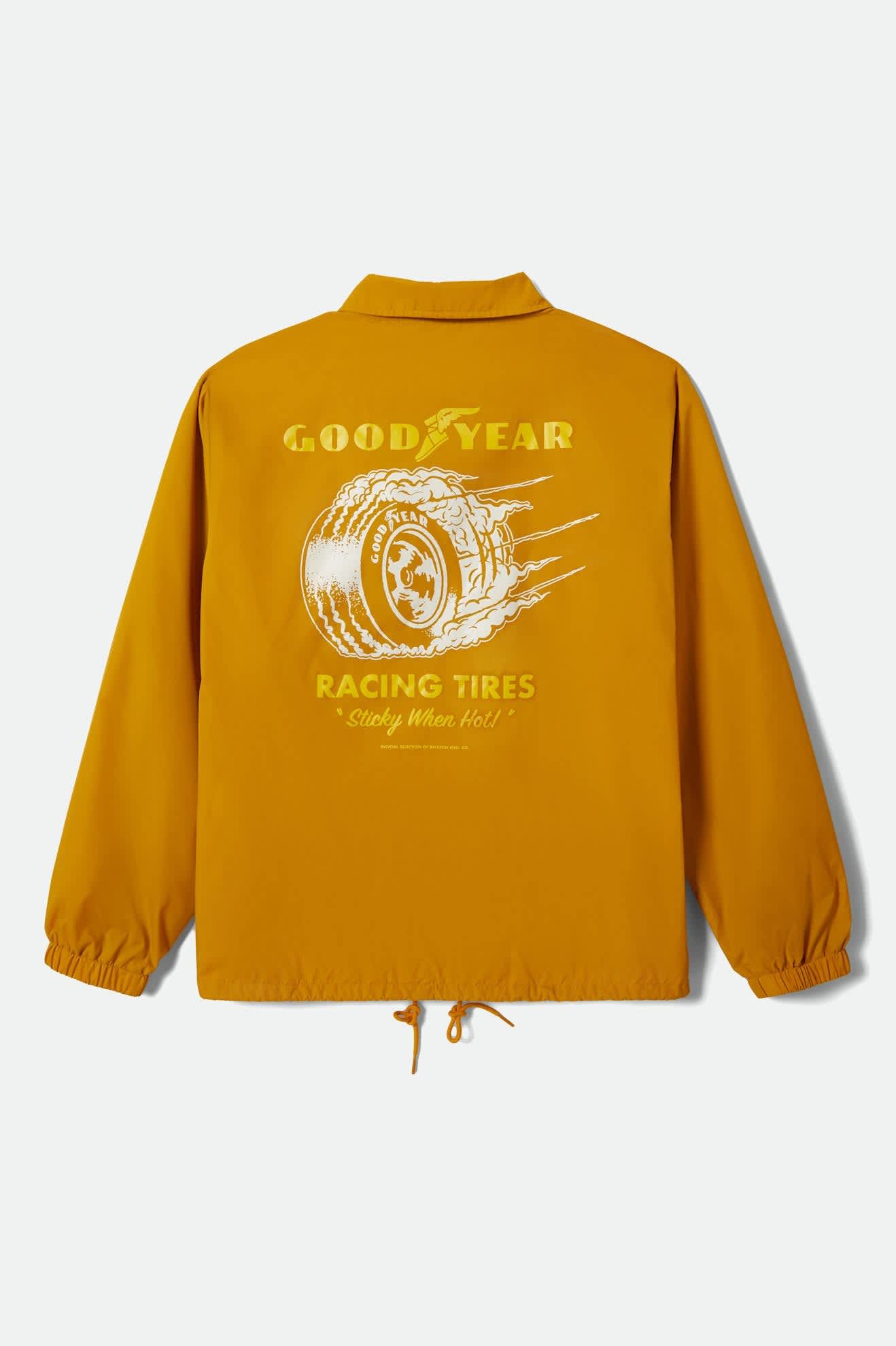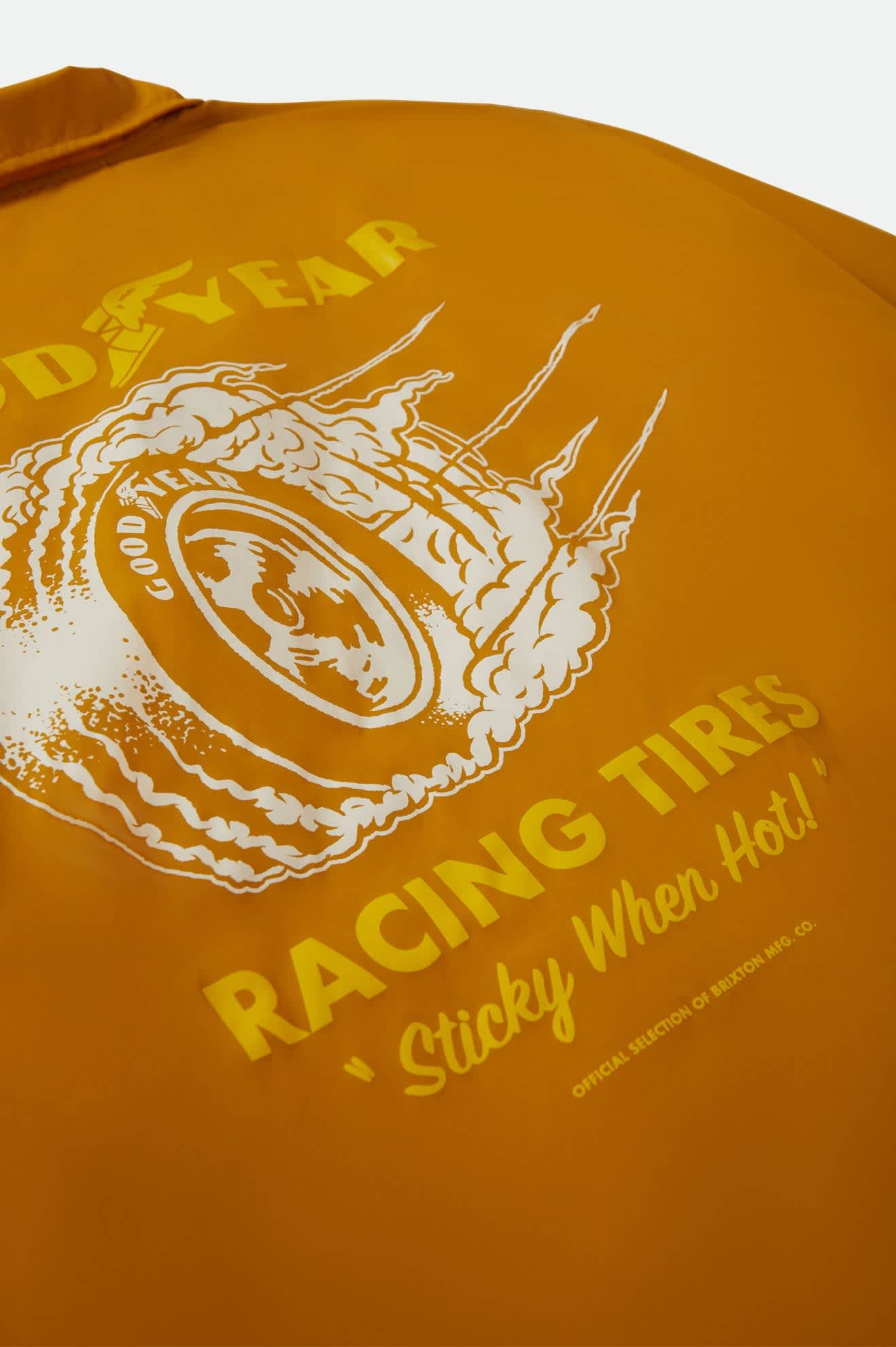Built for speed, styled for the street. This traditional windbreaker uses 100% nylon shell with off-white liner and Goodyear racing tire screen printed art on left chest and back. The classic windbreaker silhouette brings that authentic track-day energy whether you're at actual racetracks or just appreciate the connection between racing culture and street style. Nylon construction handles wind and light weather while the racing graphics speak to that need for speed mentality.