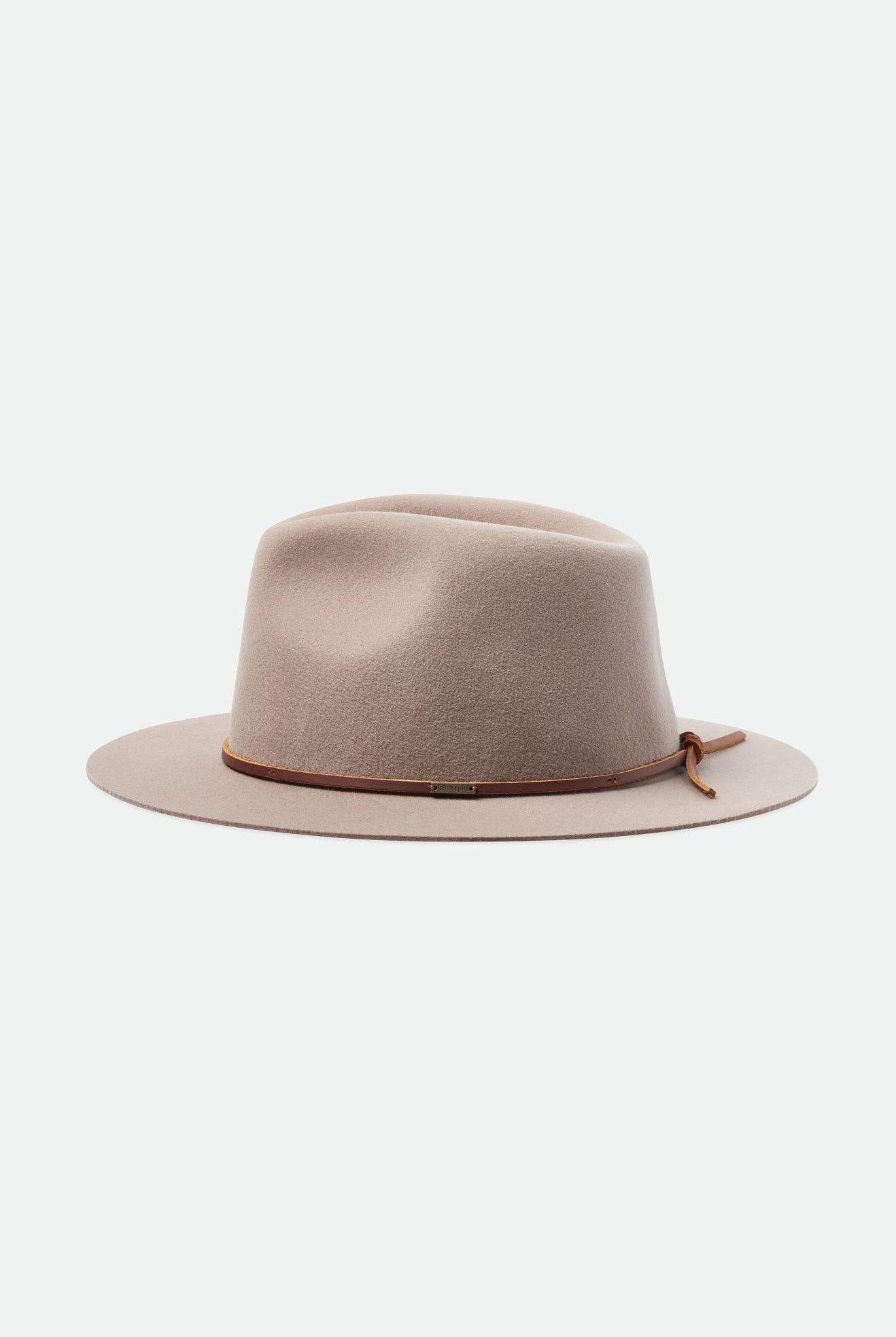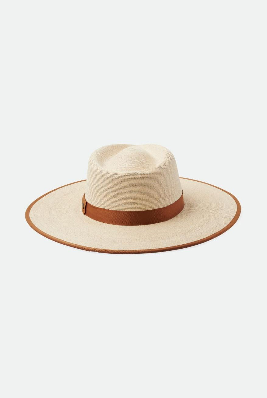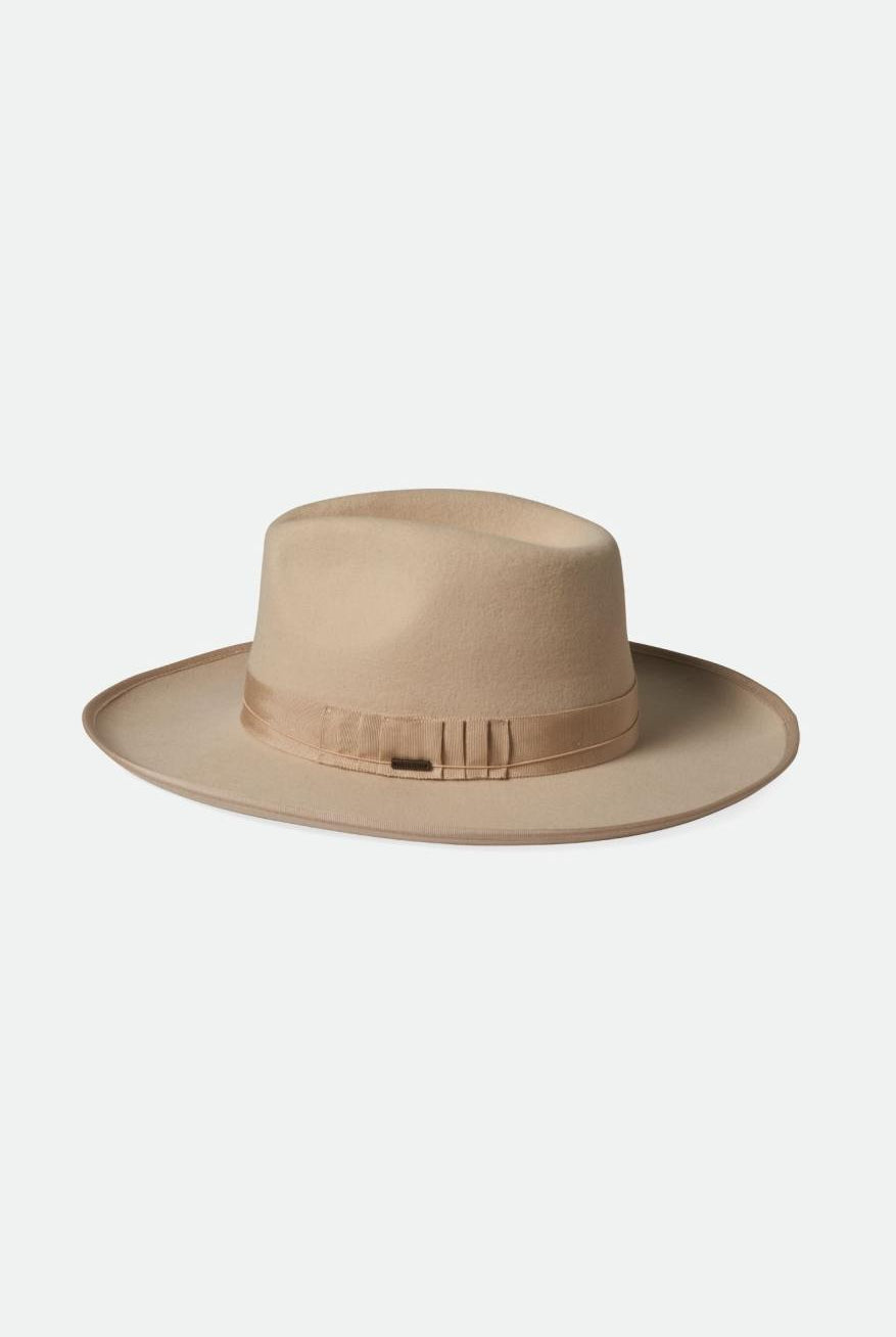 Rancher-style fedora – Howdy, cowgirl! The rancher fedora hat has a wide, stiff brim and a pinch-front crease. The brim shape can vary. Some rancher fedoras are slightly downturned in front. Others are gently turned up at the sides. Brixton’s wool felt rancher fedoras have a flat brim with a very subtle upturn around the entire brim.