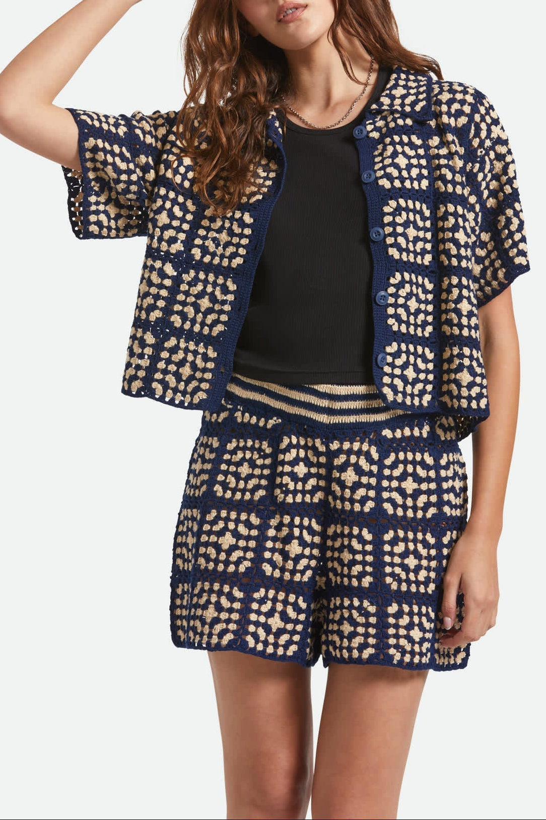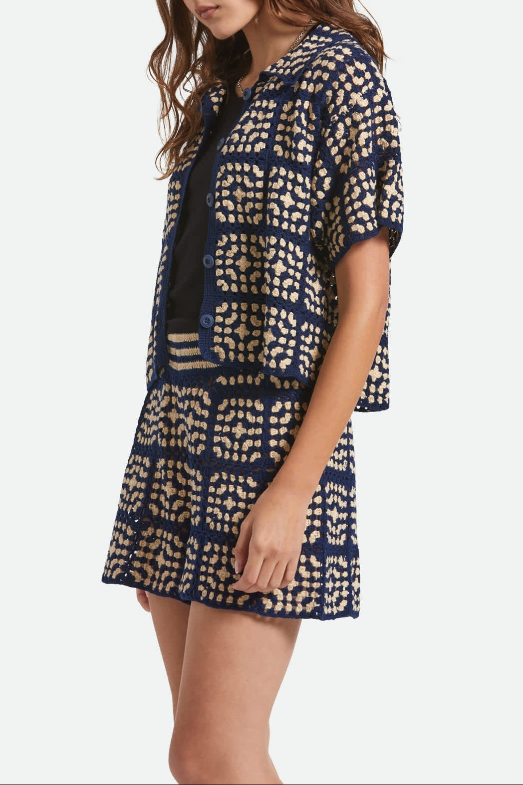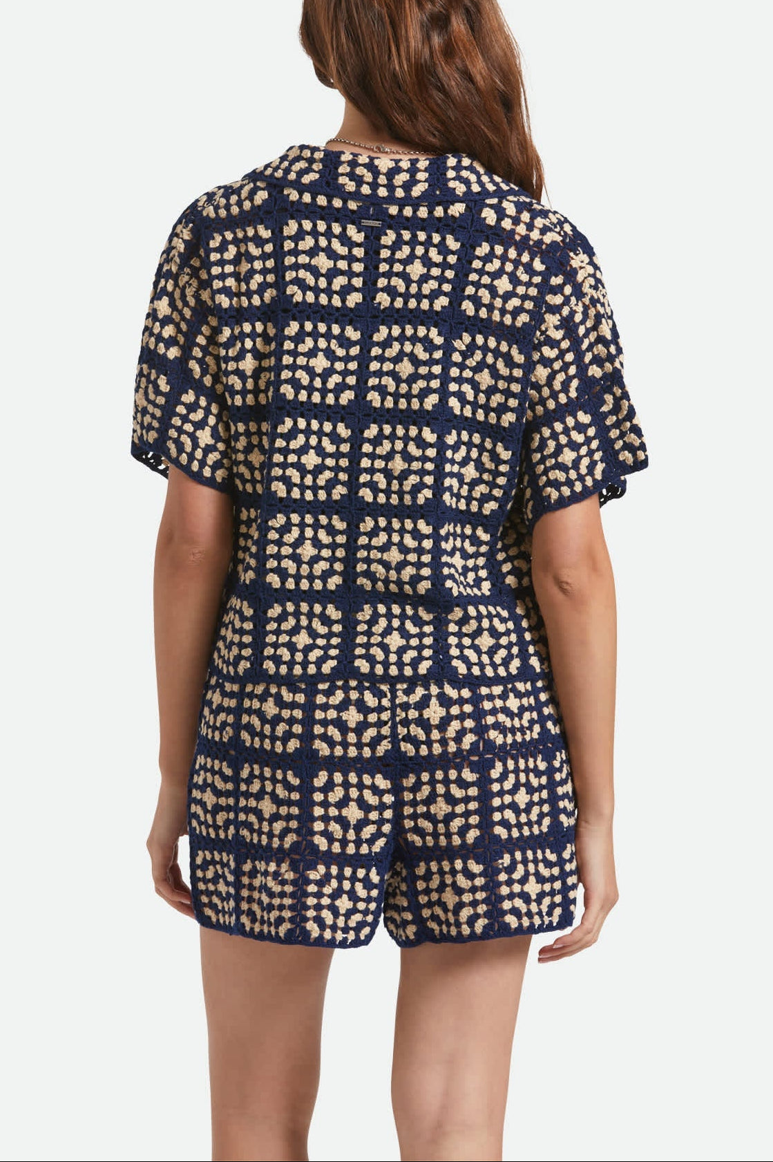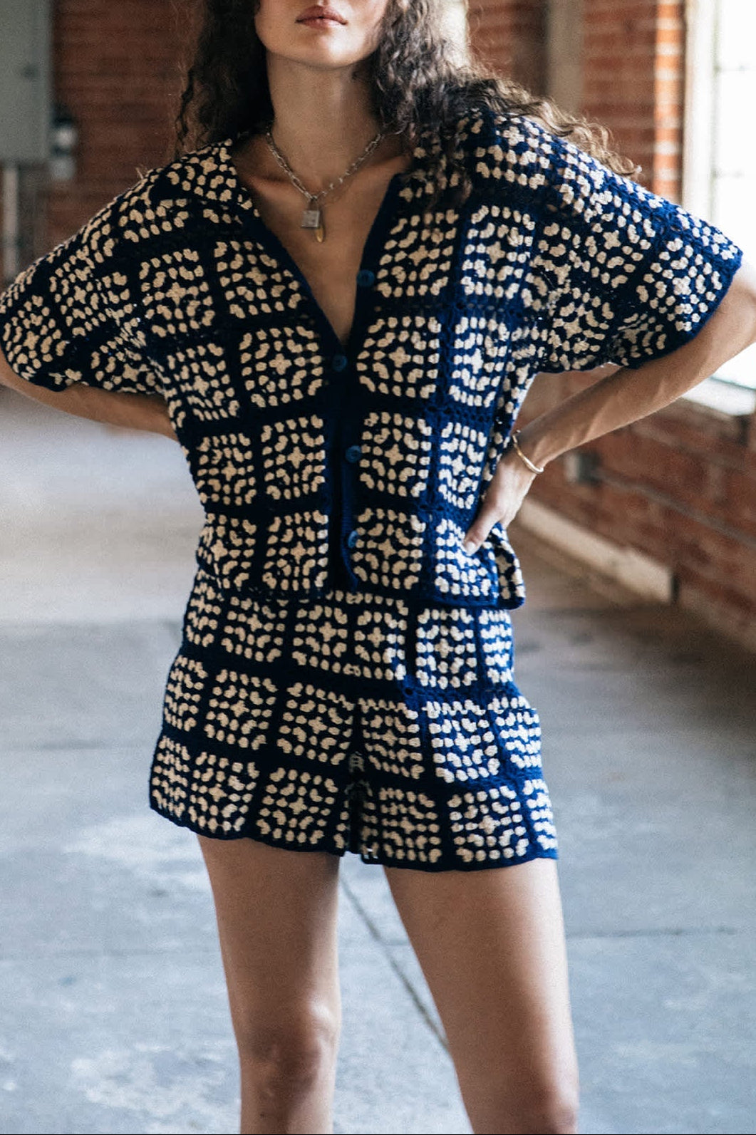 Keep it breezy and ultra-stylish this summer with the Crochet Short Sleeve Button Down. This lightweight, breathable cotton crochet top is truly handcrafted, featuring an intricate indigo and off-white pattern for a vintage-inspired look that stands out. It's made in a laid-back camp collar button-down style with short sleeves, making it easygoing and eye-catching. This isn't just a top; it's your perfect warm-weather essential for staying on-trend while keeping cool.
