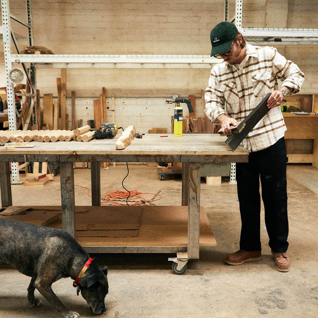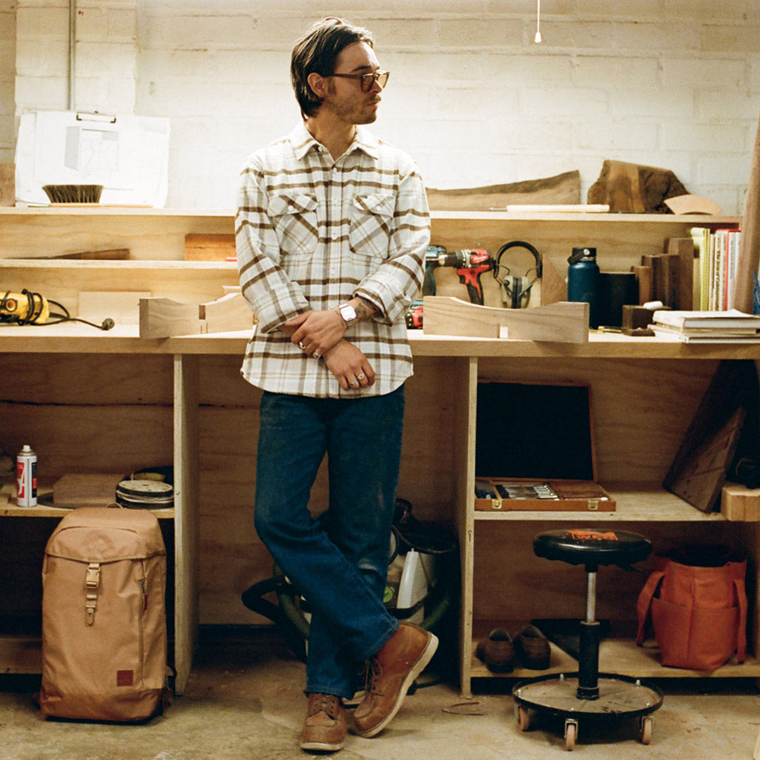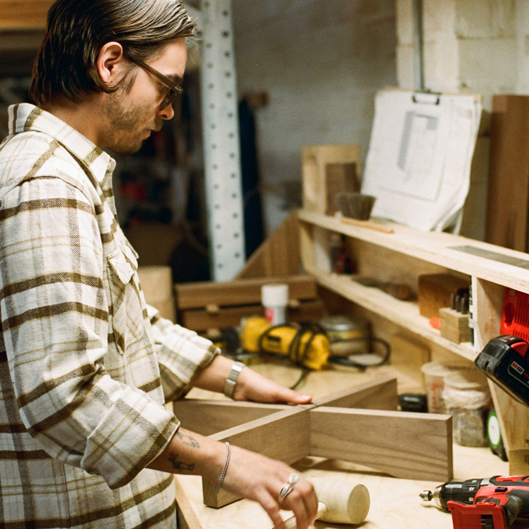 First up, meet Sam– a woodworker and modern furniture maker from Los Angeles, California. When he’s not in his workshop, you can find him in the studio making music or on set as a fashion photographer. Sam styles our New West fall collection in a way that’s cohesive with his creative, jack of all trades lifestyle.