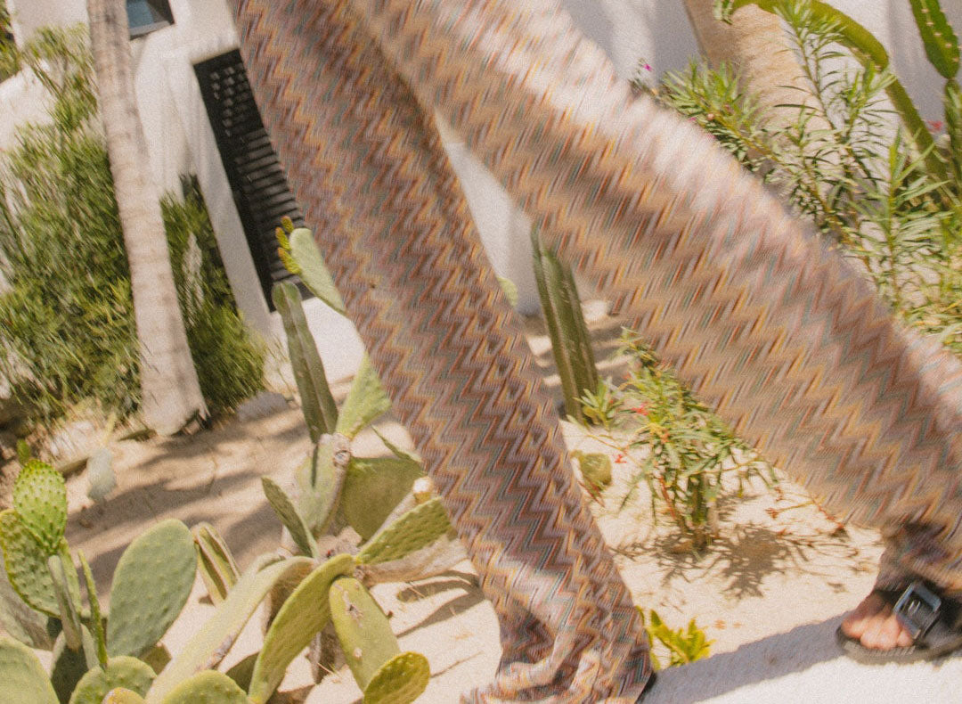 Poolside style meets all-day comfort. The Cabana Lounge Pant is made from 100% polyester in knitted mesh with a vibrant multi-color zig-zag design. The breathable mesh fabric keeps you cool, while side pockets add functionality you'll actually use. With a wide 22" leg opening and 32" inseam, these pants flow beautifully from beach days to vacation dinners to lazy afternoons by the pool.