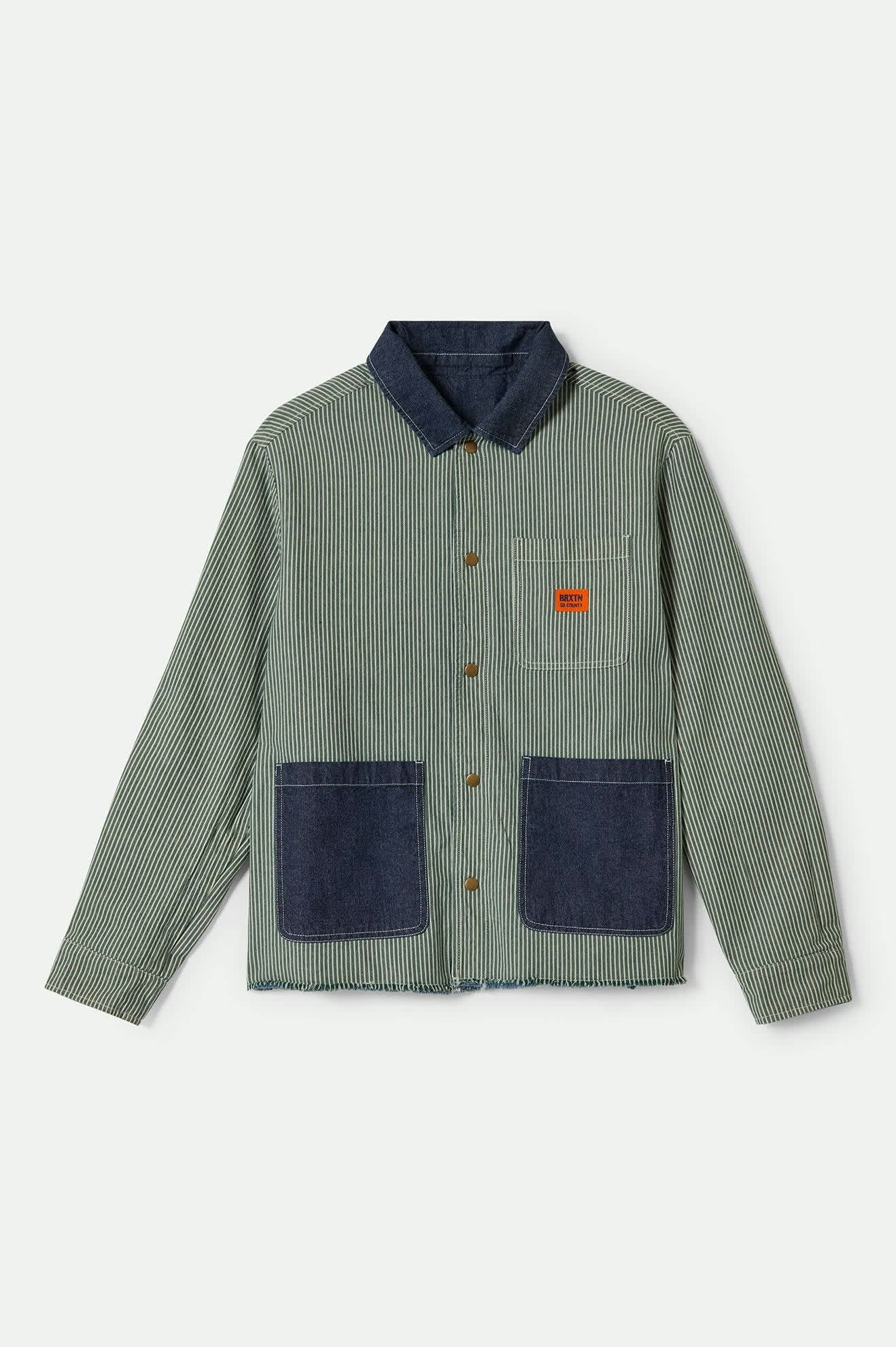 Classic workwear meets modern versatility in the Assembly Reversible Chore Jacket. The classic hickory stripe pattern on one side channels 19th-century workwear, while the other reveals indigo garment-dyed denim for a casual weekend look. In a relaxed, cropped fit, it's designed for effortless everyday wear. Multiple utility pockets and a raw, reinforced hem keep the signature workwear aesthetic intact. Treated with a soft wash, the 100% cotton fabric feels like a well-loved favorite from day one.